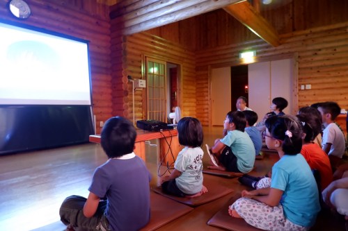 [Movie night for kids and parents in log house near our apartment]